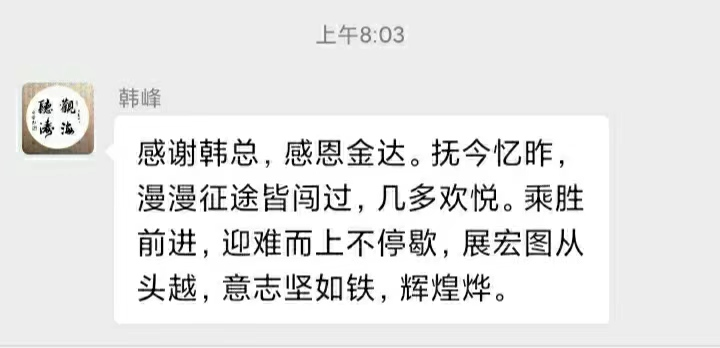 Many employees expressed thanks to company and general manager after receiving the message. The following is extracted from an impromptu poem written by employee Han Feng: